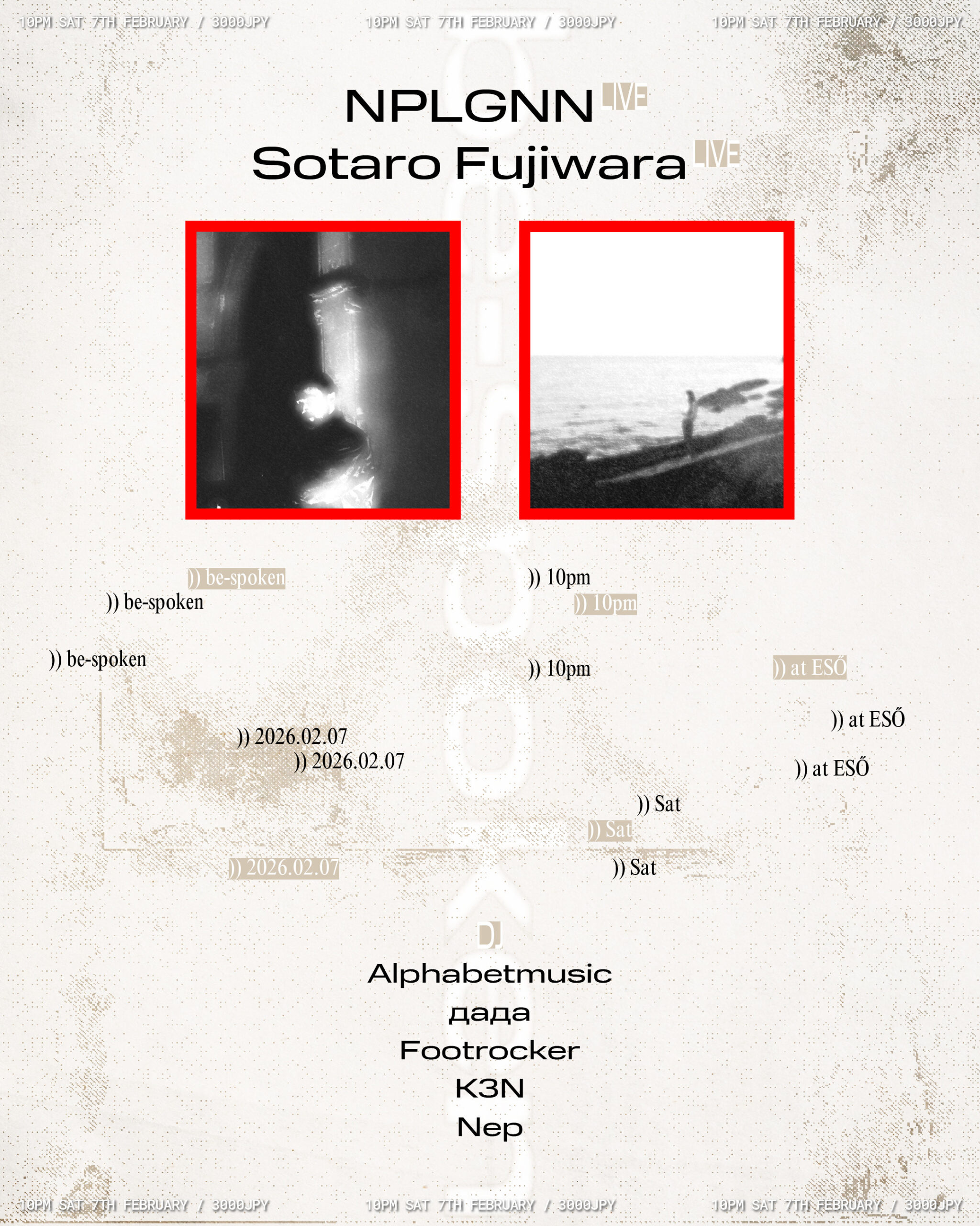 2/7(土)開催の be-spoken では、藤原草太朗が1stアルバム『Tongues』をもとにしたライブパフォーマンスを披露する。あわせてNPLGNNも、マシンライブを軸とした演奏を行う。