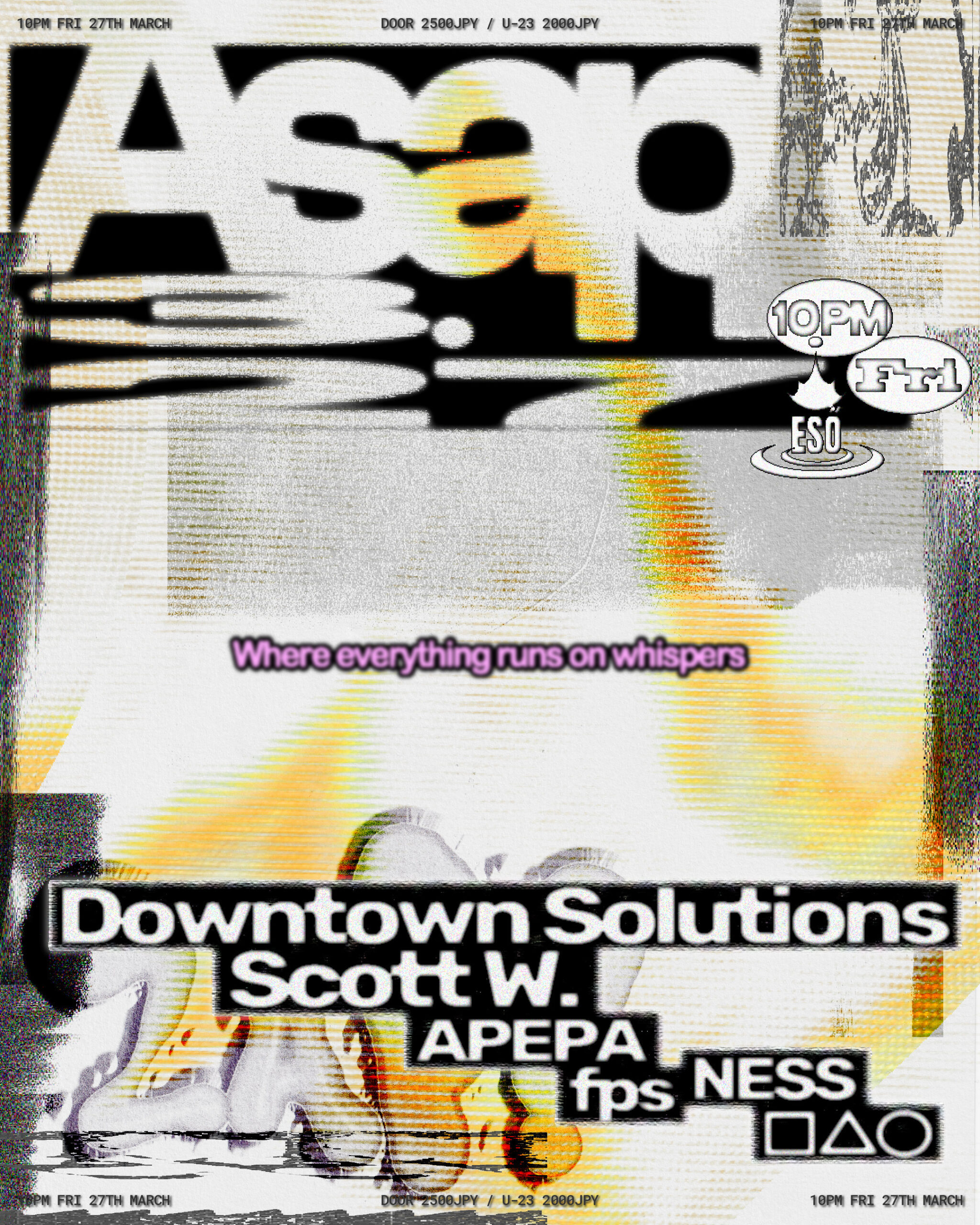 Downtown SolutionsとScott W.の2人は3/20(金)に翠月でKEGとGonnoによるパーティーRadで、翌3/21(土)には大阪NoonでKaito & g’n’bにより2013年から独自のパーティ感と自由度の高いダンスフロアを作り続けてきたMOLDIVEでのコラボレーション企画が。ESŐでは3/27(金)にfpsが現地バンクーバーで自身で体感したZAP!の温度感をベースに、APEPA、□△○、NESSらとともにAsapを開催する。