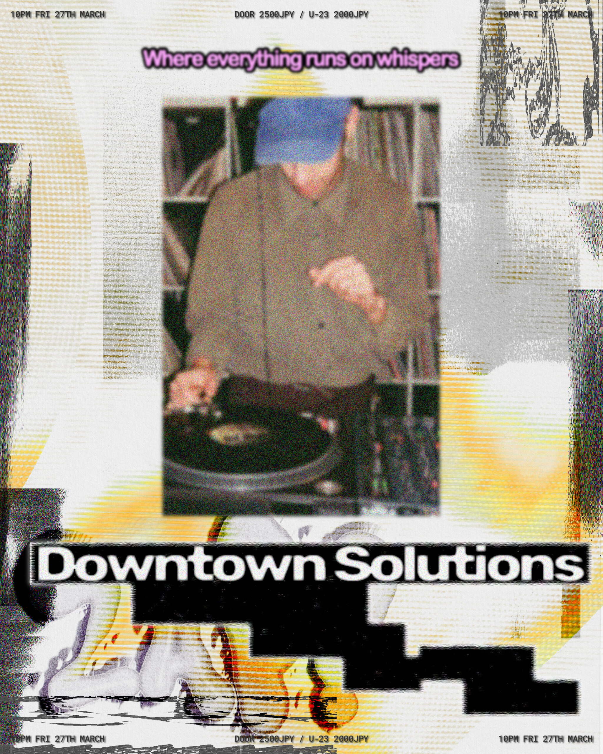 Downtown Solutions(Jean Brazeau)は、カナダ・バンクーバーを拠点とするレコーディングアーティスト、プロモーター、DJである。F7、ZAP! Deejays、Downtown Solutions、Friendly Chemistをはじめとする複数の名義で活動し、Acting Press、Pacific Rhythm、Isla、1080pといったレーベルから作品を発表してきた。バンクーバーの音楽ヴェニュー兼プロジェクトスペースDeep Blueの元キュレーターであり、2015年より音楽制作、ライブパフォーマンス、スタジオ運営、ブッキング、ラインナップのキュレーション、フライヤーデザインに携わっている。All Rest No Peopleとの共作アルバム『Lost In Flower』(Acting Press、2025年)収録のシングル「Icarus」で、2026年Juno Awardにノミネートされた。2022年からは、Scott W.と共に主宰するバンクーバーの人気パーティーシリーズZAP!にてレギュラーでDJを務めている。